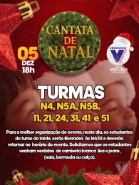 No dia 04 de dezembro, às 18h, nossas turmas N2, N3, 12, 13, 14, 22, 23, 32, 42 e 52 irão brilhar em mais uma Cantata de Natal cheia de encanto, música e emoção!