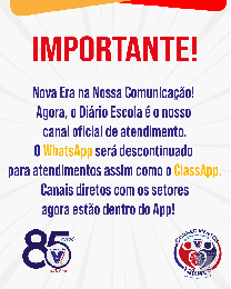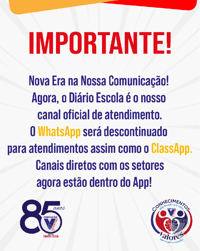 Estamos modernizando nosso atendimento para ficarmos ainda mais próximos de você. O Diário Escola agora é o nosso canal oficial! Centralizamos tudo em um só lugar para facilitar o seu dia a dia e garantir que nenhuma informação importante se perca.